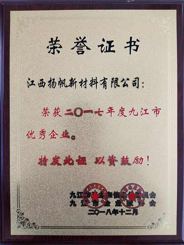 12月14日,從九江市工業和信息化委員會以及九江市企業家協會聯合主辦的“2018年度九江市企業家協會年會及頒獎大會”傳來喜訊,江西揚帆新材公司獲評2017年度“九江市優秀企業獎”、2017年度 “九江工業企業第22名”。