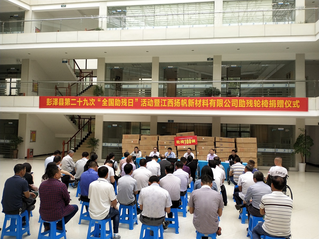 5月17日上午十點半,彭澤縣第二十九次“全國助殘日”活動暨江西揚帆新材料有限公司助殘輪椅捐贈儀式在公司辦公樓大廳如期舉行,彭澤縣政協張仁初主任、彭澤縣殘聯宗翔理事長、各鄉鎮殘聯理事長、公司總經理陳育亮、常務副總余立志及部分殘疾人代表參加了此次捐贈儀式。