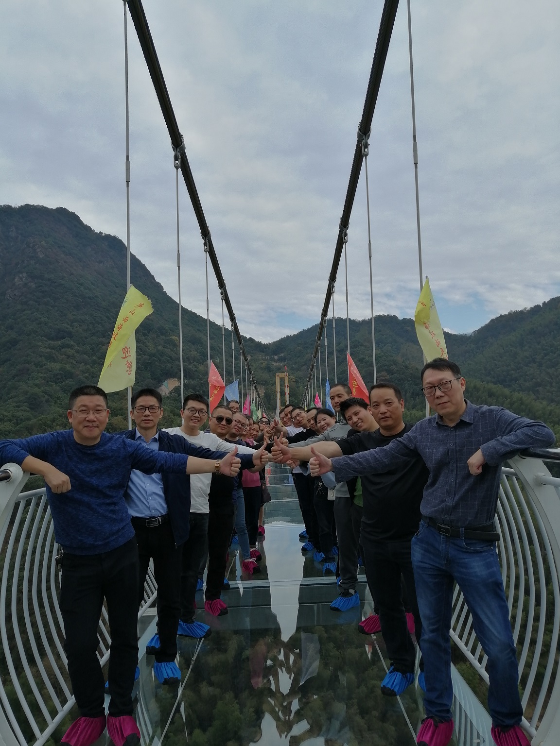 16日一早陽(yáng)光明媚,在一路的歡歌笑語(yǔ)中,大家首先來到了“人在橋上走,景在底下游”的廬山西海9D玻璃橋。 此橋凌駕于峰巒疊嶂的兩山之間,全程用透明玻璃構(gòu)成,全長(zhǎng)398米最高落差108米寬2米,遠(yuǎn)遠(yuǎn)望之仿佛隱形于叢林之中,站在玻璃天橋上有步入云端的感覺,玻璃橋中段還有震撼9D效果,輕輕一踩玻璃便在腳下爆碎蔓延,逼真刺激的破碎聲音咔咔咔地在耳邊響起。這使得團(tuán)隊(duì)里多名恐高隊(duì)友,一開始都覺得這是不可能跨越的鴻溝,紛紛打起退堂鼓。但在同事們的再三鼓勵(lì)下,最終克服恐懼,戰(zhàn)勝自己!通過玻璃棧道后大家回程嘗試了廬山西海9D玻璃滑道,全長(zhǎng)518米的雙道雙滑玻璃滑道,不僅周圍風(fēng)光一覽無余,更切實(shí)感受了一把速度與激情。