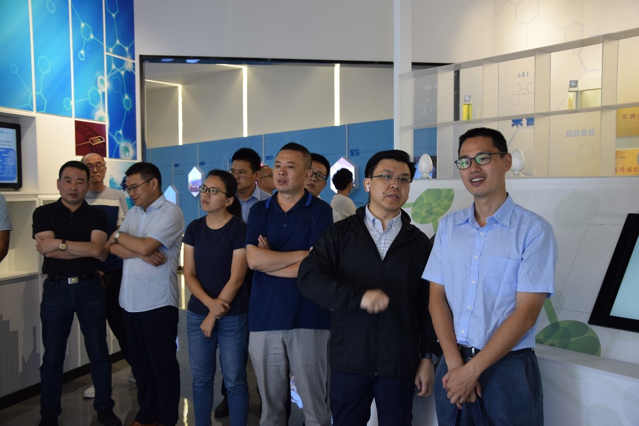 考察團一行先是參觀了企業發展(產品)展示廳和黨建展廳。樊彬董事長向各位領導就公司發展歷程、企業文化、產品工藝流程、設備裝置、市場前景及黨建工作情況等作了簡要介紹。并對上虞生產基地目前的主要產品、未來發展規劃、競爭優勢、人才戰略方面及化工制造業工藝升級工作做了重點匯報。雙方就目前社會、經濟形勢下精細化工、新材料、光固化等領域的發展情況、所遇到的問題及解決方法作了深入的交流。