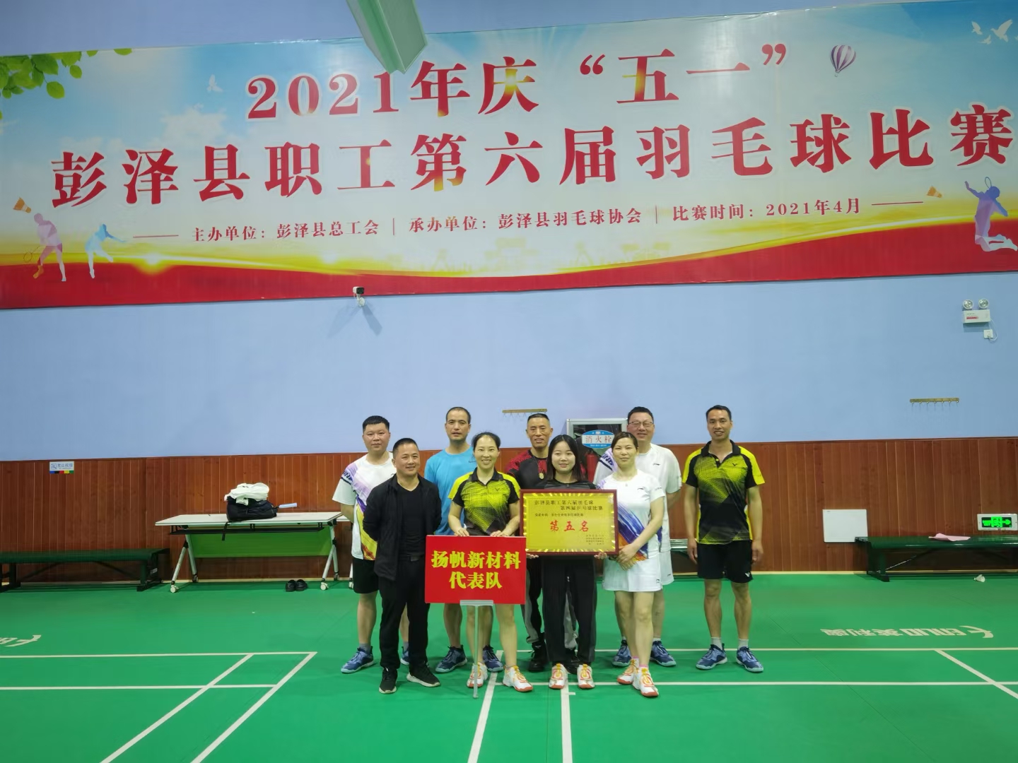 五一前夕,江西揚帆新材參加了慶“五一”彭澤縣職工第六屆羽毛球比賽。公司經過層層選拔,挑選了9名羽毛球愛好員工組成“揚帆新材隊”,由胡金輝帶隊全程參與了此次比賽的混、單全部賽次,最終在主力隊員賽前訓練受傷缺席的不利情況下,仍取得第五名的好成績。