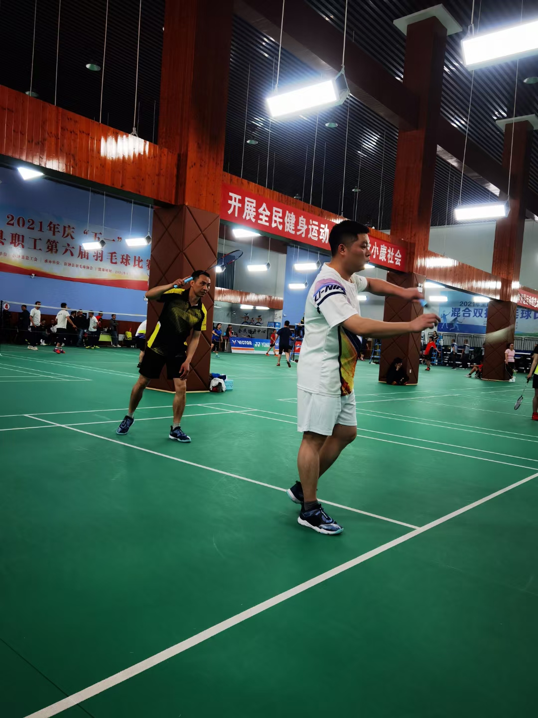 早上經過簡短的開幕儀式后,比賽正式打響!高遠球、吊球、網前搓球、扣殺……!在每一場比賽當中羽毛球的這些競技戰術被我們隊員發揮的淋漓盡致,賽場外加油吶喊聲接連不斷,更加鼓舞了隊員們在場上的斗志,每一個多拍回合的對抗都是那么的扣人心弦,而為了取得比賽勝利,隊長與隊員們絞盡腦汁排兵布陣,最終經過一天激烈角逐, “揚帆新材隊”以小組第二出線進入8強。