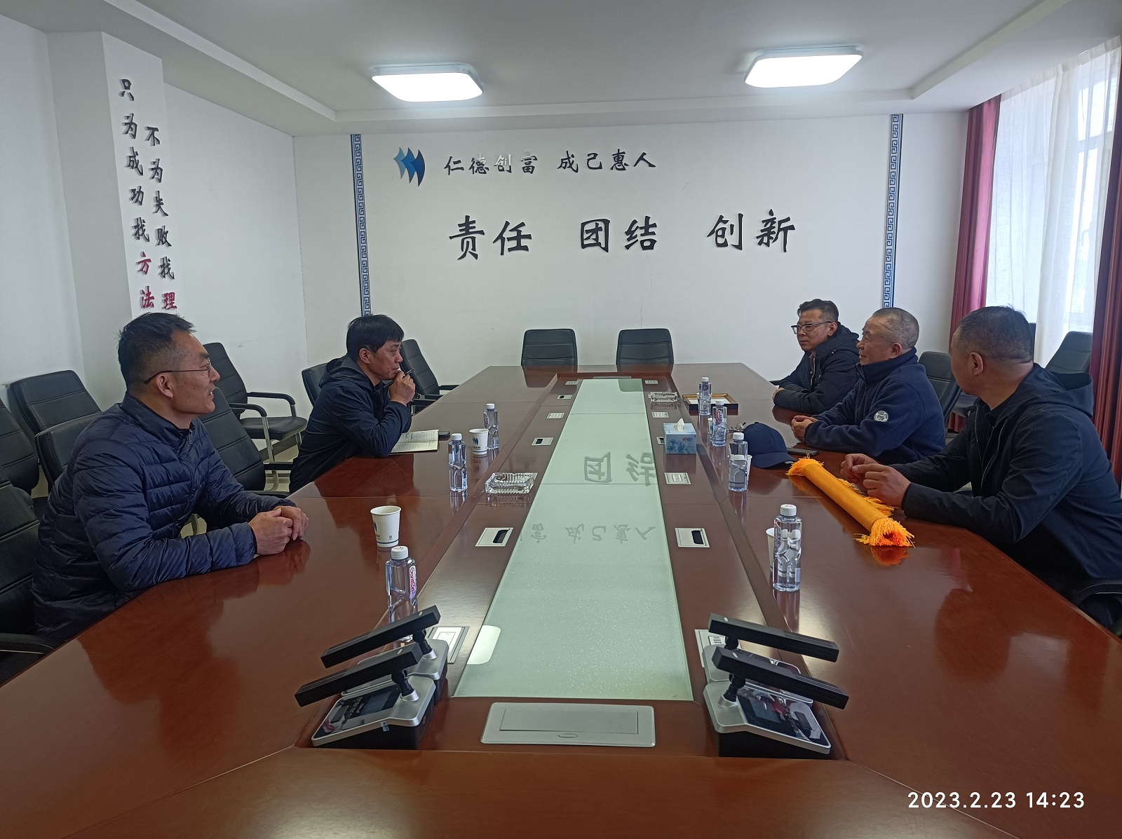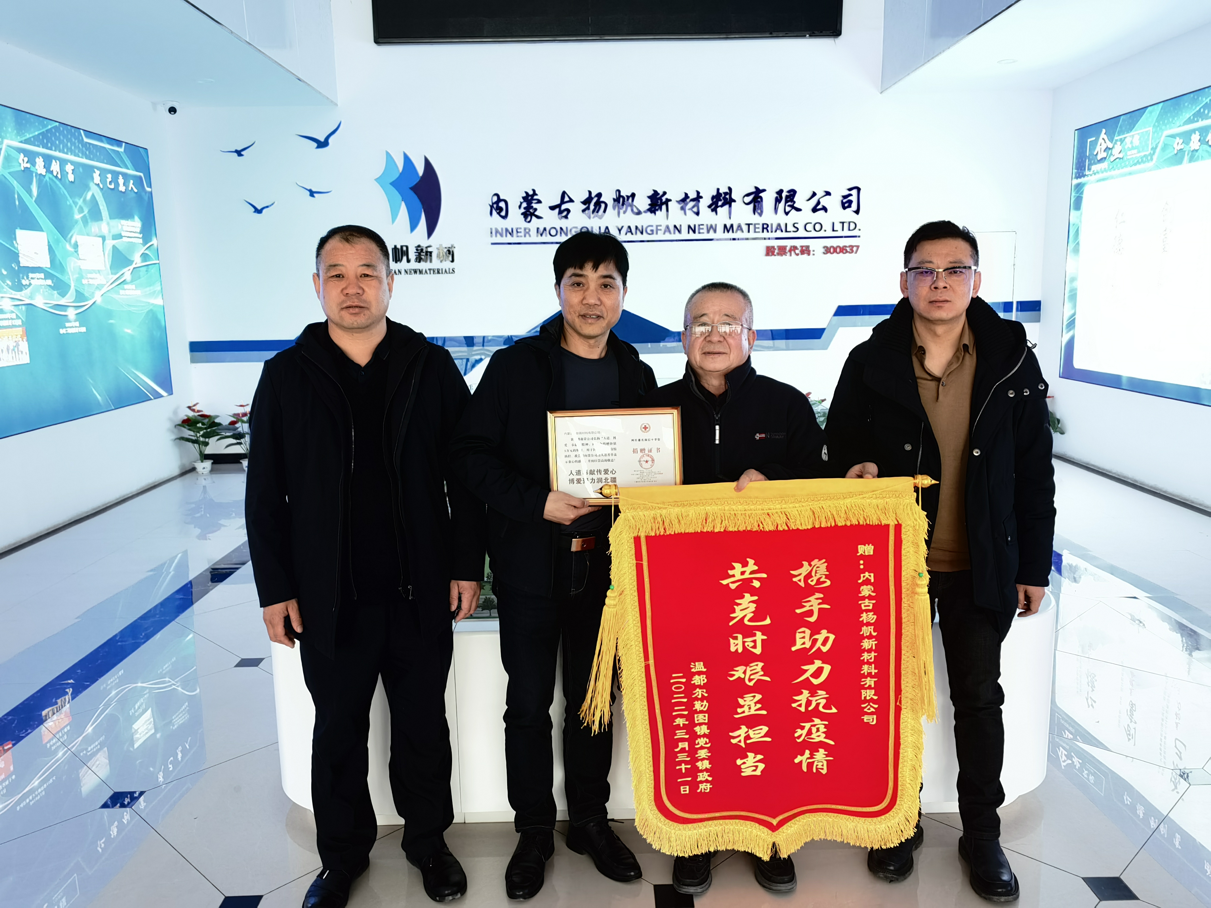 223日下午,內蒙古阿拉善盟林業和草原局孔德榮調研員、阿左旗溫都爾勒圖鎮徐書記、王鎮長一行四人,為答謝去年疫情期間子公司內蒙揚帆的無償捐助,將一面印有“攜手助力抗疫情,攻克時艱顯擔當”的錦旗和阿左旗紅十字會捐贈證書送到了內蒙揚帆。內蒙揚帆總經理楊涌波代表公司領受了錦旗和證書,并和客人就公司基本情況和企業文化進行了座談交流。