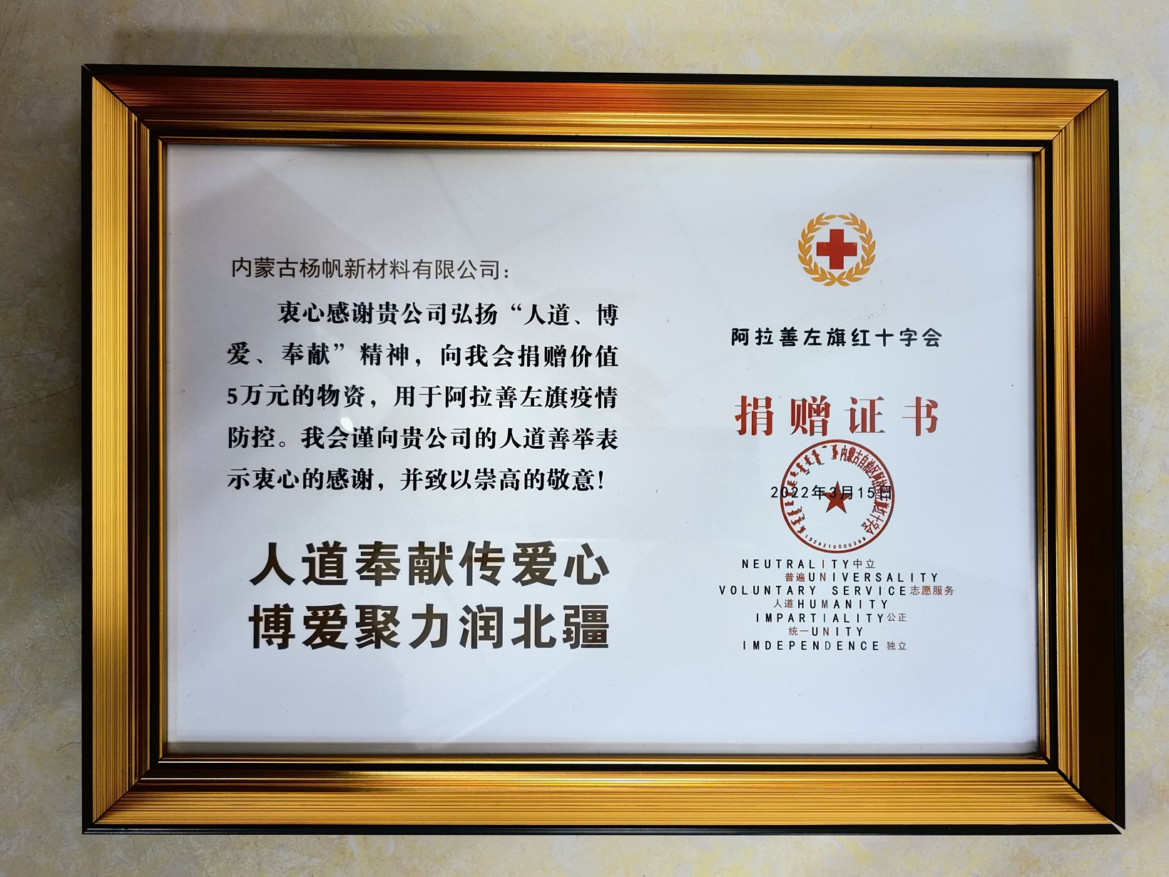20224月份,位于內蒙古阿拉善左旗最南部的溫都爾勒圖鎮突發疫情,該鎮位于甘肅、寧夏和內蒙古三省交界處,地理位置特殊,醫療和生活物資較為匱乏。內蒙揚帆在得到求援信息后,立即籌集資金協調車輛,連夜馳援400多公里,將價值5萬余元的醫療和生活物資送至溫都爾勒圖鎮,及時緩解了疫情物資短缺的燃眉之急。此舉彰顯了揚帆人積極服務社會、回報社會的擔當精神,踐行了揚帆新材“仁德創富 成己惠人”的核心價值觀。