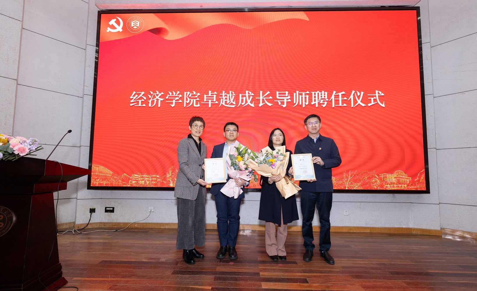 應(yīng)四愛(ài)處長(zhǎng)、杜群陽(yáng)書記為樊彬、楊新妃頒發(fā)聘書